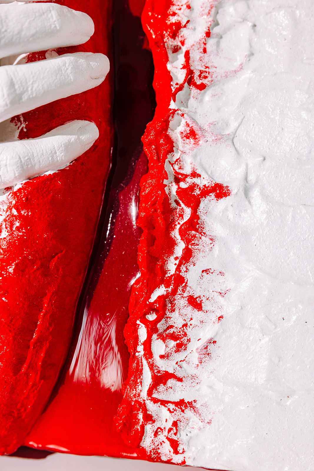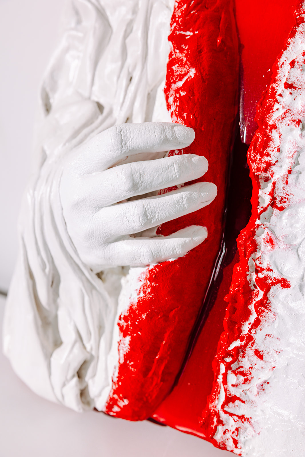 Das Hochrelief „Aufbrechen“ aus der Serie „Innerstes“ (2024) ist ein skulpturales Mixed-Media-Objekt mit ausgeprägter physischer Präsenz. Mit einer Größe von 30 x 30 cm und einer Tiefe von bis zu 8 cm überschreitet das Werk bewusst die klassische Bildfläche und tritt deutlich in den Raum. Es gibt Momente, in denen Oberfläche nicht mehr trägt. Momente, in denen etwas aufbrechen muss. „Aufbrechen“ zeigt diesen Übergang. Eine schützende, weiß modellierte Hülle wird zur Seite gedrückt. Dahinter erscheint ein intensives Rot - roh, unmittelbar, sichtbar. Die plastisch ausgearbeitete Oberfläche wirkt zunächst ruhig und kontrolliert. Doch unter dieser Schicht offenbart sich eine emotionale Spannung. Das Werk thematisiert das Sichtbarmachen innerer Prozesse, die häufig im Verborgenen bleiben.