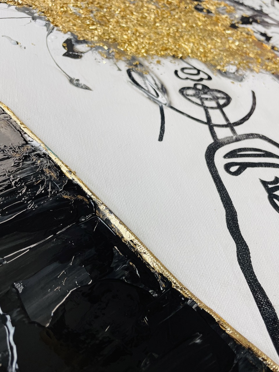 „Fokus“ ist ein Werk, das sich nicht erklärt, sondern bündelt. Die zentrale Figur ist nur angedeutet. Eine Linie, ein Gesicht, eine Geste. Der Finger vor den Lippen wirkt ruhig. Fast still. Doch darüber bricht etwas auf. Gold legt sich roh über den Kopfbereich. Nicht glatt, nicht kontrolliert - sondern bewusst unruhig. Gedanken, Impulse, Energie. Nicht geordnet, sondern sichtbar gemacht. Das goldene V-Element teilt die Fläche. Ein Bruch. Eine Kante. Eine Entscheidung. Es wirkt wie ein Schnitt durch das Bild oder wie ein Moment, in dem sich etwas öffnet. Das Werk bewegt sich genau in diesem Spannungsfeld - Zwischen Stille und innerem Lärm. Zwischen Kontrolle und Ausdruck. Zwischen „Nicht reden“ und maximaler Präsenz.