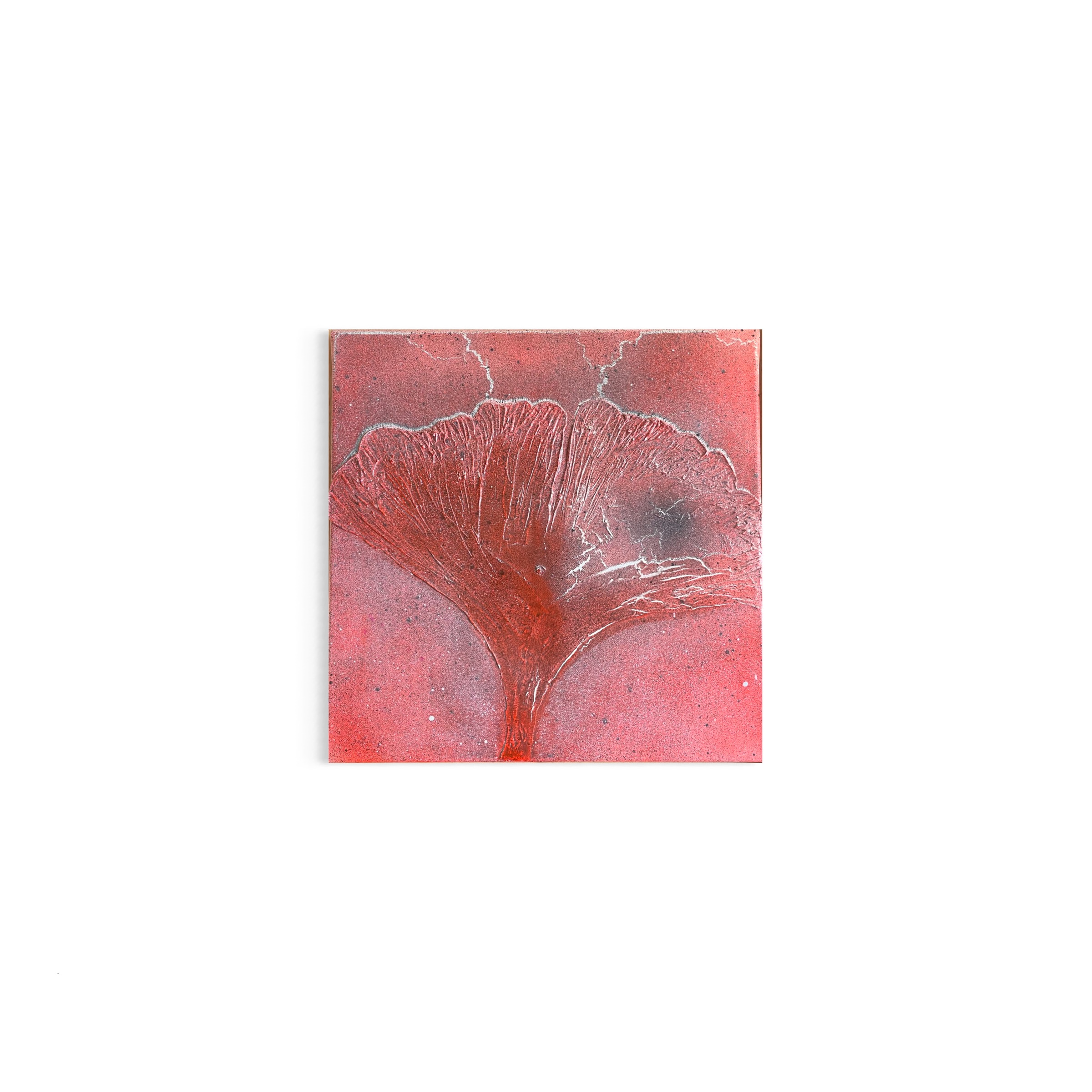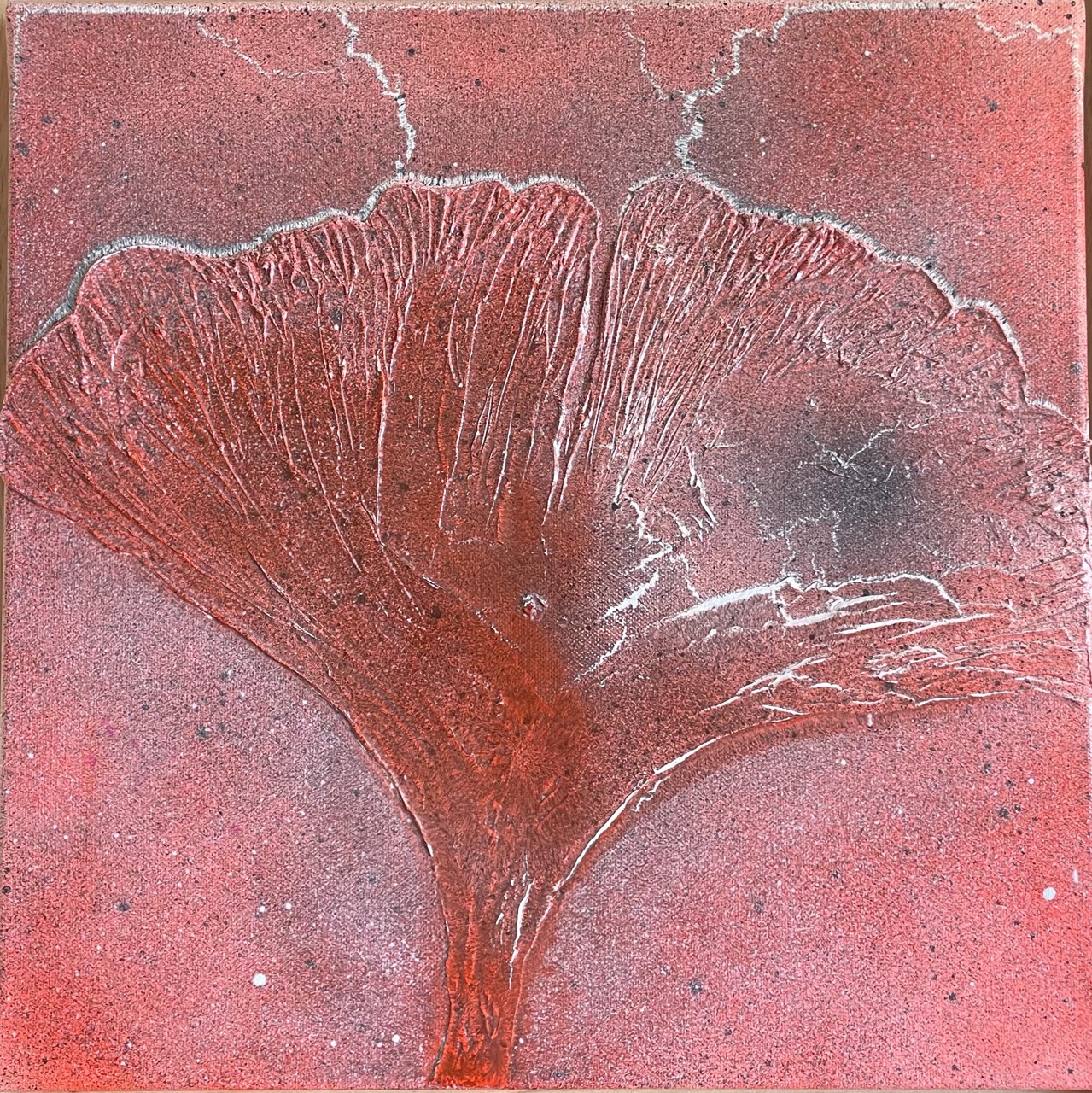 „Ginkgo“ ist ein sehr konzentriertes Werk. Im Zentrum steht die klare Form des Blattes. Fast reduziert auf das Wesentliche. Die Fläche wirkt ruhig, fast monochrom. Warme, erdige Terrakottatöne bestimmen das Bild und verleihen ihm Tiefe und Ruhe. Feine Brüche, Linien und unregelmäßige Strukturen durchziehen die Oberfläche. Sie lassen das Blatt nicht dekorativ wirken, sondern lebendig. Das Motiv ist vertraut und gleichzeitig abstrahiert. Es geht weniger um Darstellung als um Präsenz. Ein Werk, das nicht laut ist. Aber sehr klar.