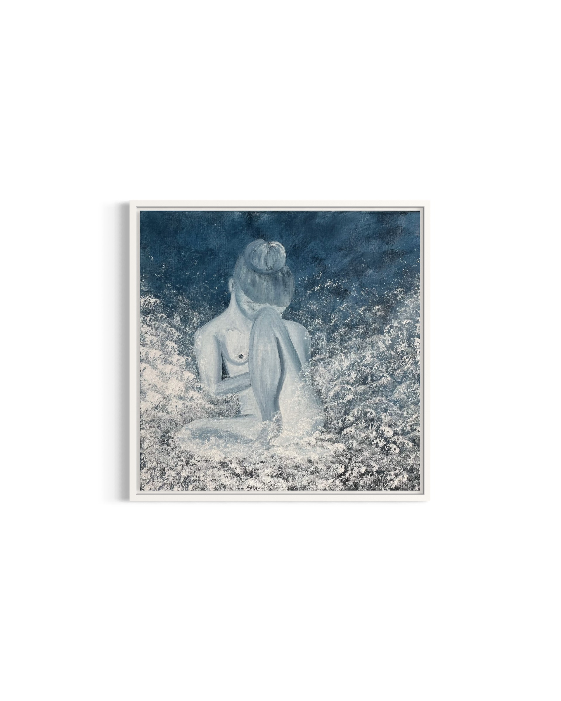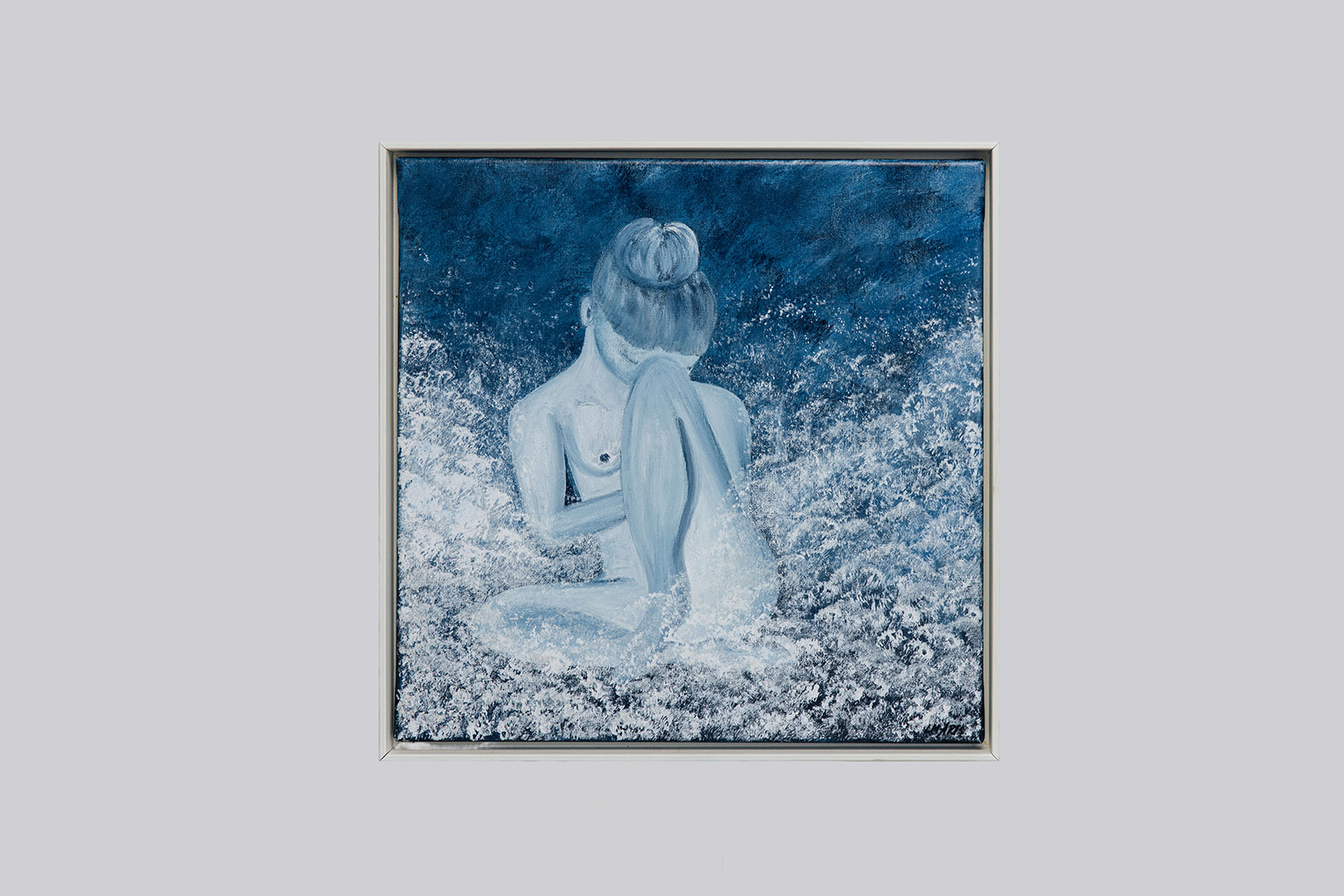 Das Werk wurde mit Acrylfarbe und Strukturpasten auf Leinwand aufgebaut. Die Oberfläche ist bewusst unruhig und reliefartig. Der Bereich um die Figur ist dichter gearbeitet, während die Figur selbst ruhiger und glatter bleibt. Das tiefe Blau trägt die Bildfläche, während Weiß die Struktur aufbricht und Licht in die Oberfläche bringt. Je nach Perspektive verändert sich die Wahrnehmung der Tiefe.