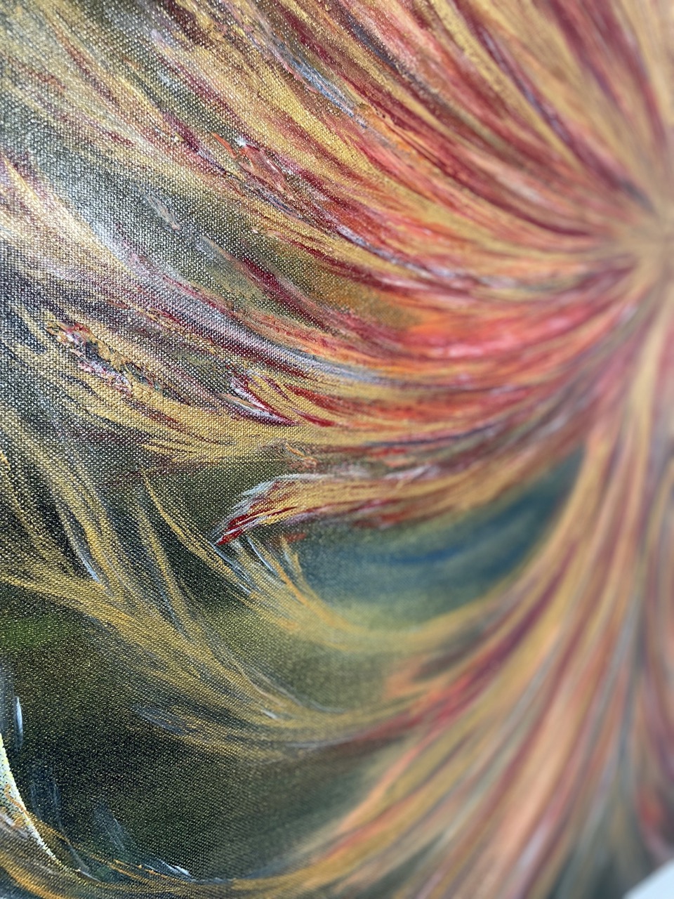 Die Arbeit ist in Schichten aufgebaut, bleibt dabei aber ruhiger in der Oberfläche als andere Werke der Serie. Acrylfarbe und feine Strukturpasten werden fließend verarbeitet. Die Übergänge sind weich, die Bewegungen sichtbar, aber nicht aufgebrochen. Das glänzende Finish verstärkt die Lichtwirkung, besonders in den Goldtönen. Je nach Blickwinkel verändert sich die Tiefe der Farbschichten.