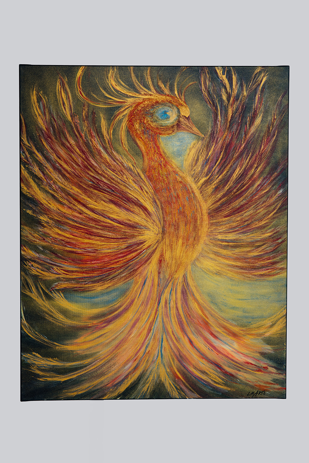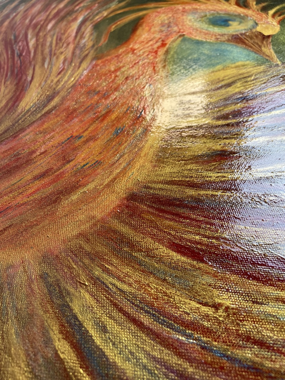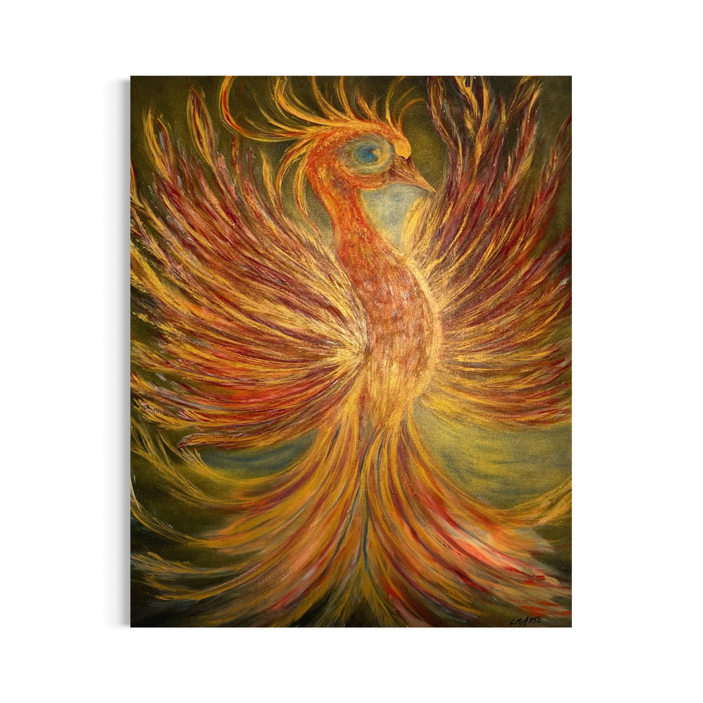 „Phönix - Wiedergeburt in Gold“ wirkt gesammelt und klar. Die Bewegung ist da, aber sie ist nicht explosiv, sondern getragen. Die Figur öffnet sich aus der Mitte heraus. Die Flügel breiten sich aus, ohne zu drängen. Alles bleibt in einem ruhigen Fluss. Gold, Rot und erdige Töne überlagern sich und bilden eine warme, dichte Oberfläche. Der Hintergrund hält die Form und gibt ihr Raum. Auffällig ist das einzelne, kühle Blau im Auge. Ein ruhiger Gegenpunkt inmitten der Wärme. Es bündelt den Blick und bringt eine klare Präsenz in das Bild. Das Werk erzählt nicht von Ausbruch, sondern von einem inneren Wandel. Von einem Moment, in dem sich etwas neu ordnet.