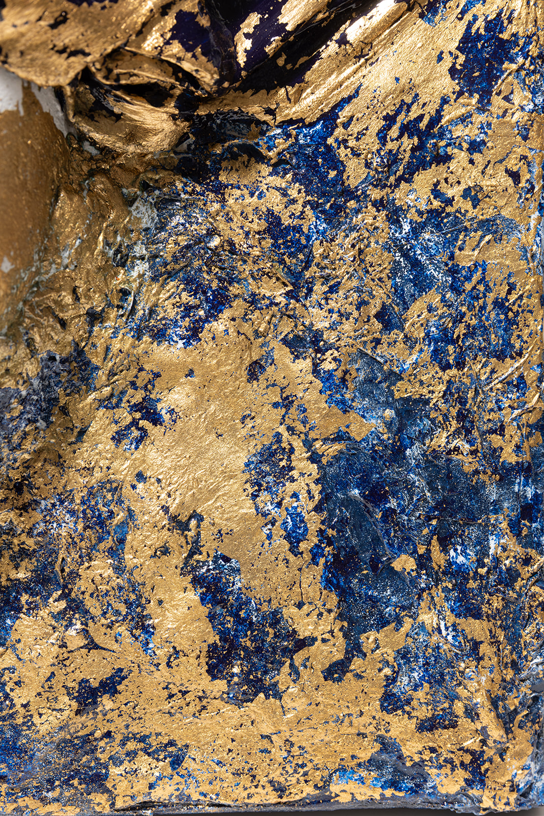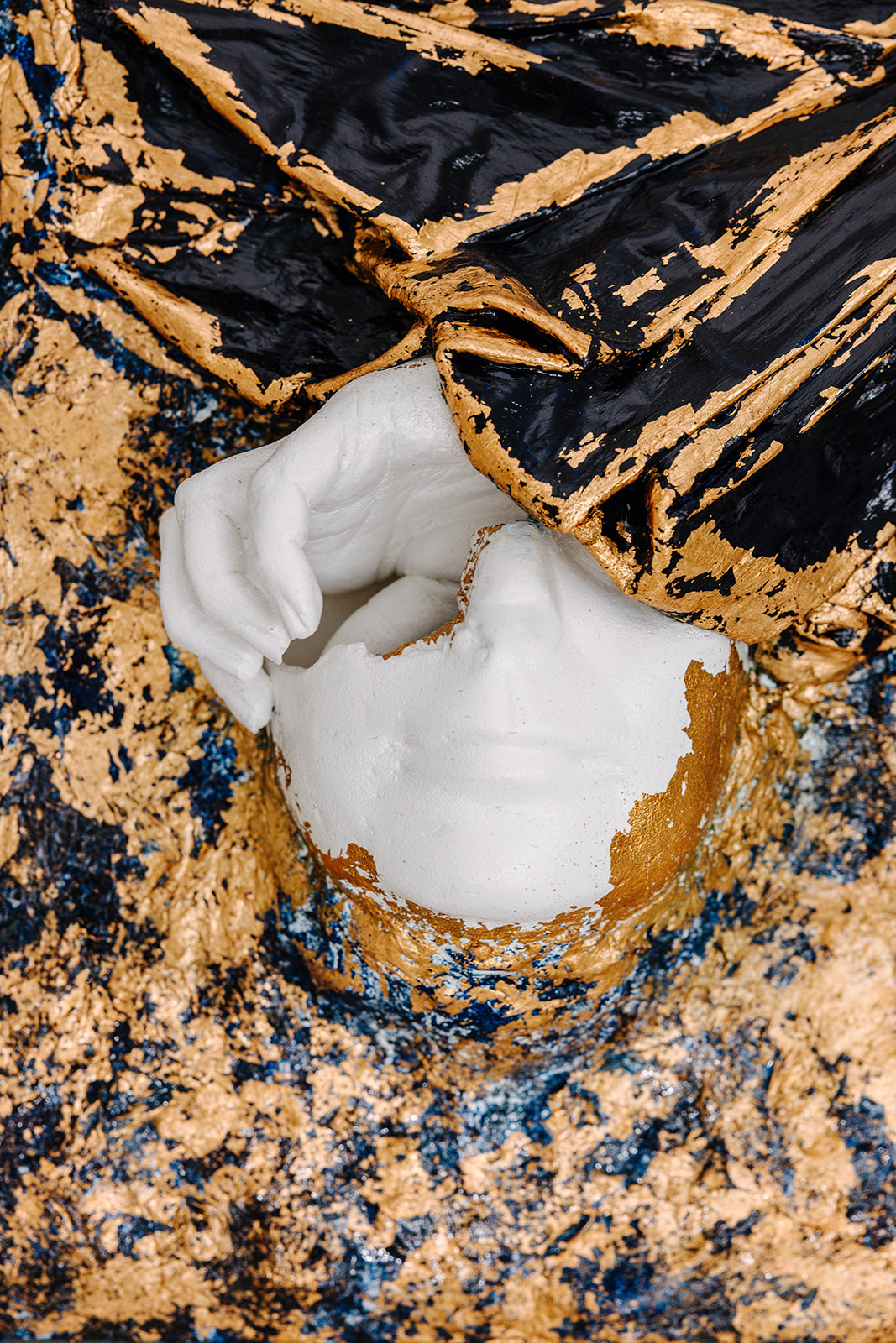 Material wird nicht glatt. Es darf brechen. Gips, Stoff, Modellierpaste. Alles verändert sich im Prozess. Gold ist für mich kein Schmuck. Es liegt auf der Oberfläche, reagiert auf Licht, verschiebt sich.